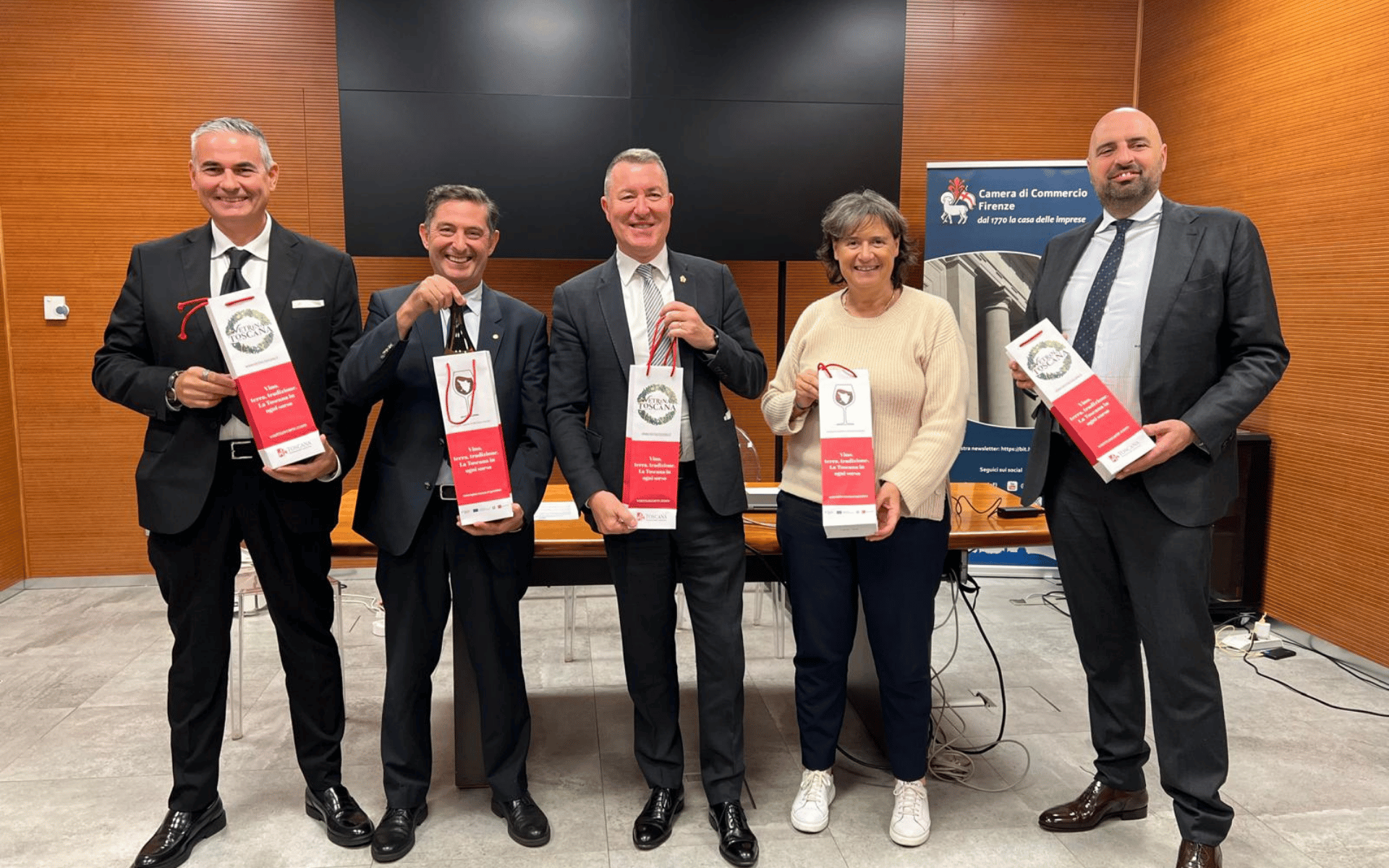 Il presidente della Camera di Commercio di Firenze Massimo Manetti è intervenuto per un saluto: “Per la Camera di Commercio è sempre un piacere ospitare eventi delle associazioni di categoria e di “Vetrina Toscana” – ha sottolineato. Lo è particolarmente in questa occasione che pone al centro della conferenza stampa di oggi il vino, le cui produzione, commercializzazione e consumo sono strategici e una risorsa fondamentale per l’economia del territorio. Sono d’accordo con gli organizzatori dell’evento di oggi, secondo i quali le “wine bag”, che consentiranno ai clienti di portare a casa in modo sicuro e pratico il vino non consumato al ristorante, possano centrare il duplice obiettivo di valorizzare la cultura enogastronomica toscana e di diffondere pratiche di consumo responsabile, permettendo di portare a casa quanto rimane della bottiglia, senza doversi sentire obbligati ad abusarne per non lasciare non consumato un prodotto d’eccellenza”.